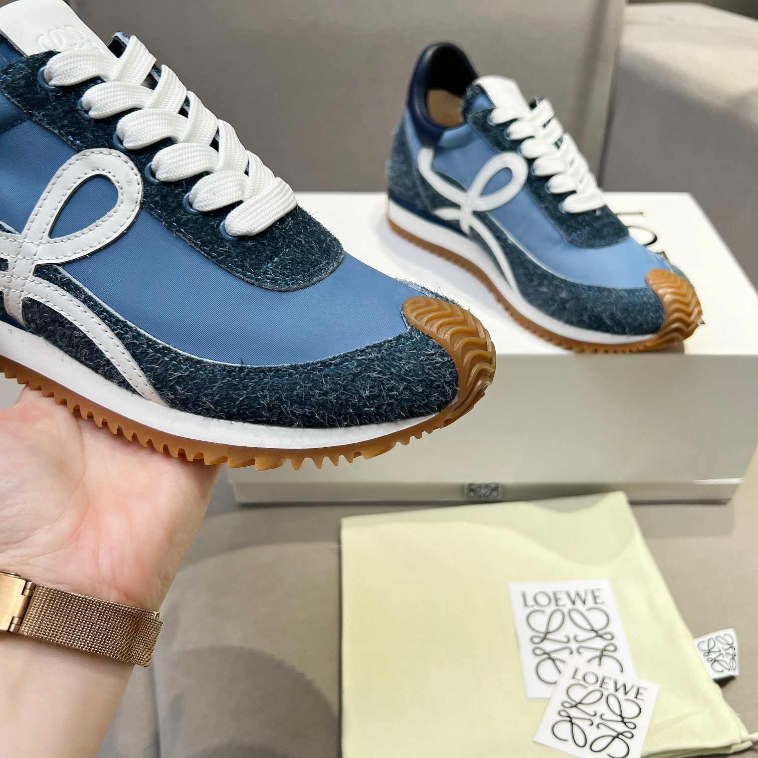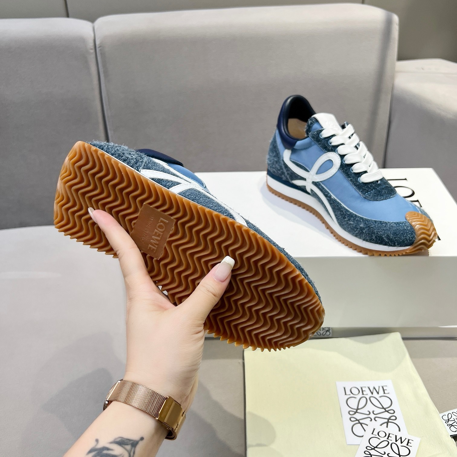 This shoes is AAAAA 1:1 quality (superb). Materials used are identical to the original ones. Loewe trademark marks are indistinguishable to the authentic. Photos take by actual shoes, what you receive will be 100% same with our photos.