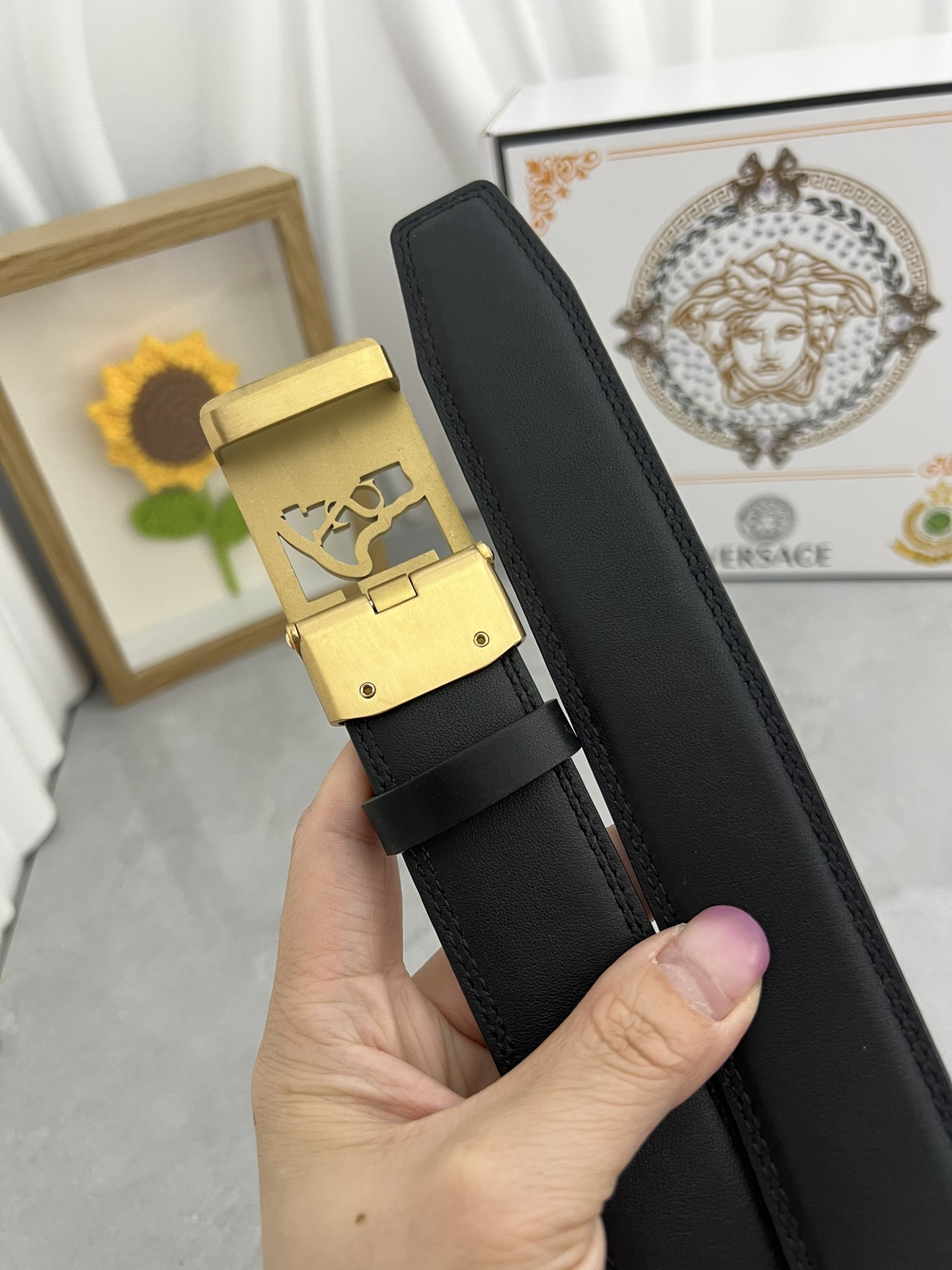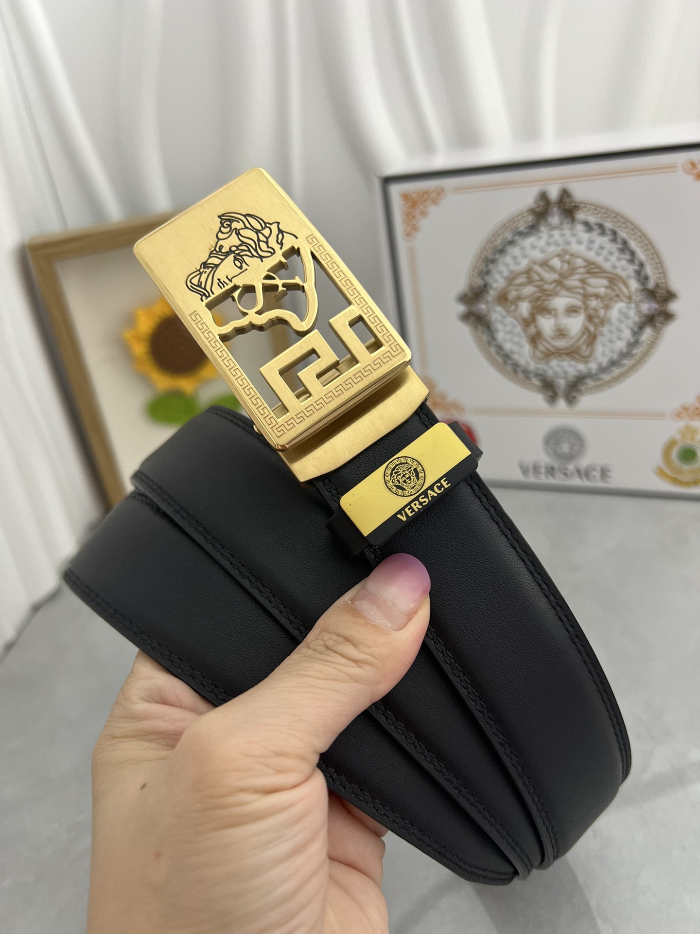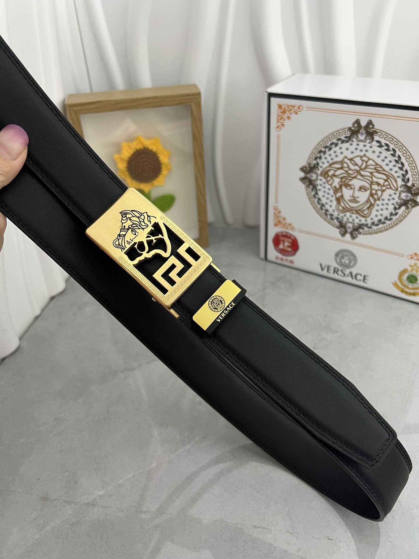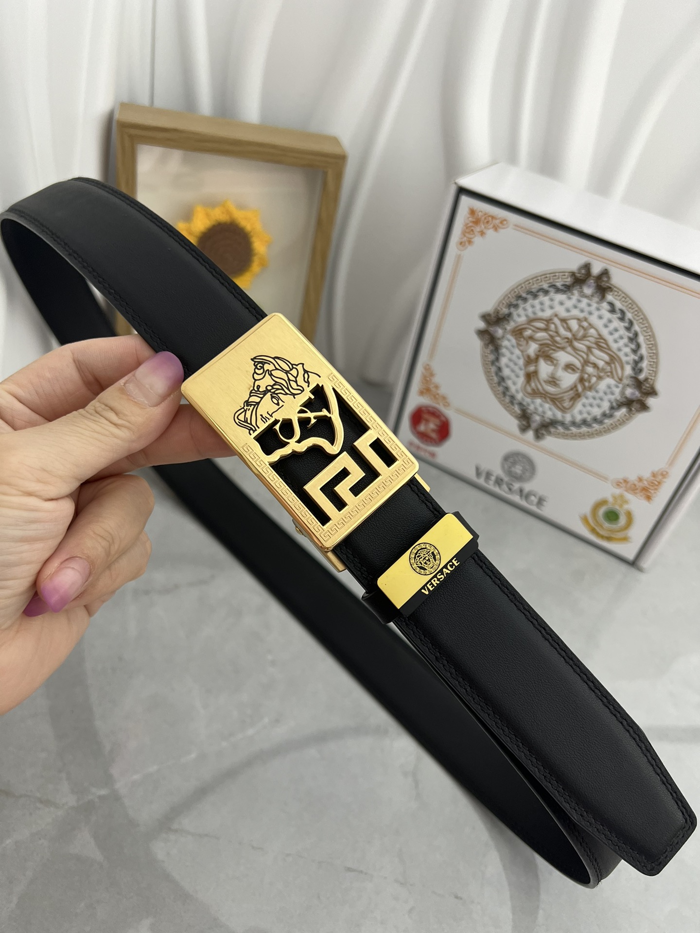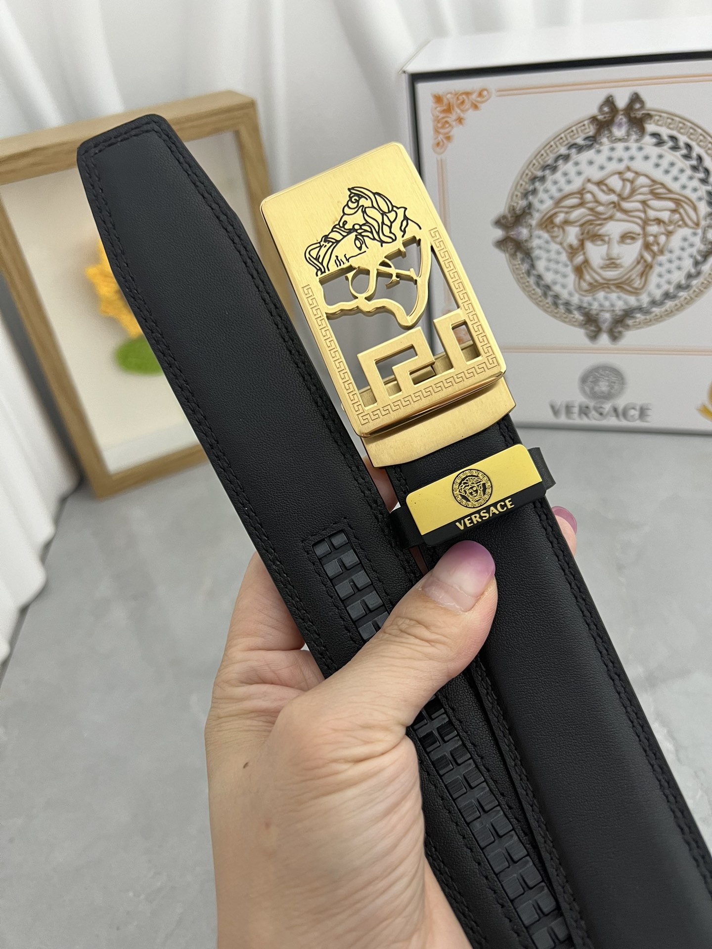 This belt is AAAAA 1:1 quality (superb). Materials used are identical to the original ones. Versace trademark marks are indistinguishable to the authentic. Photos take by actual belt, what you receive will be 100% same with our photos.
