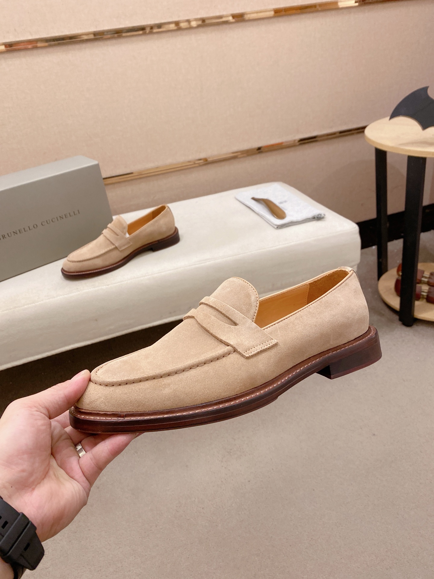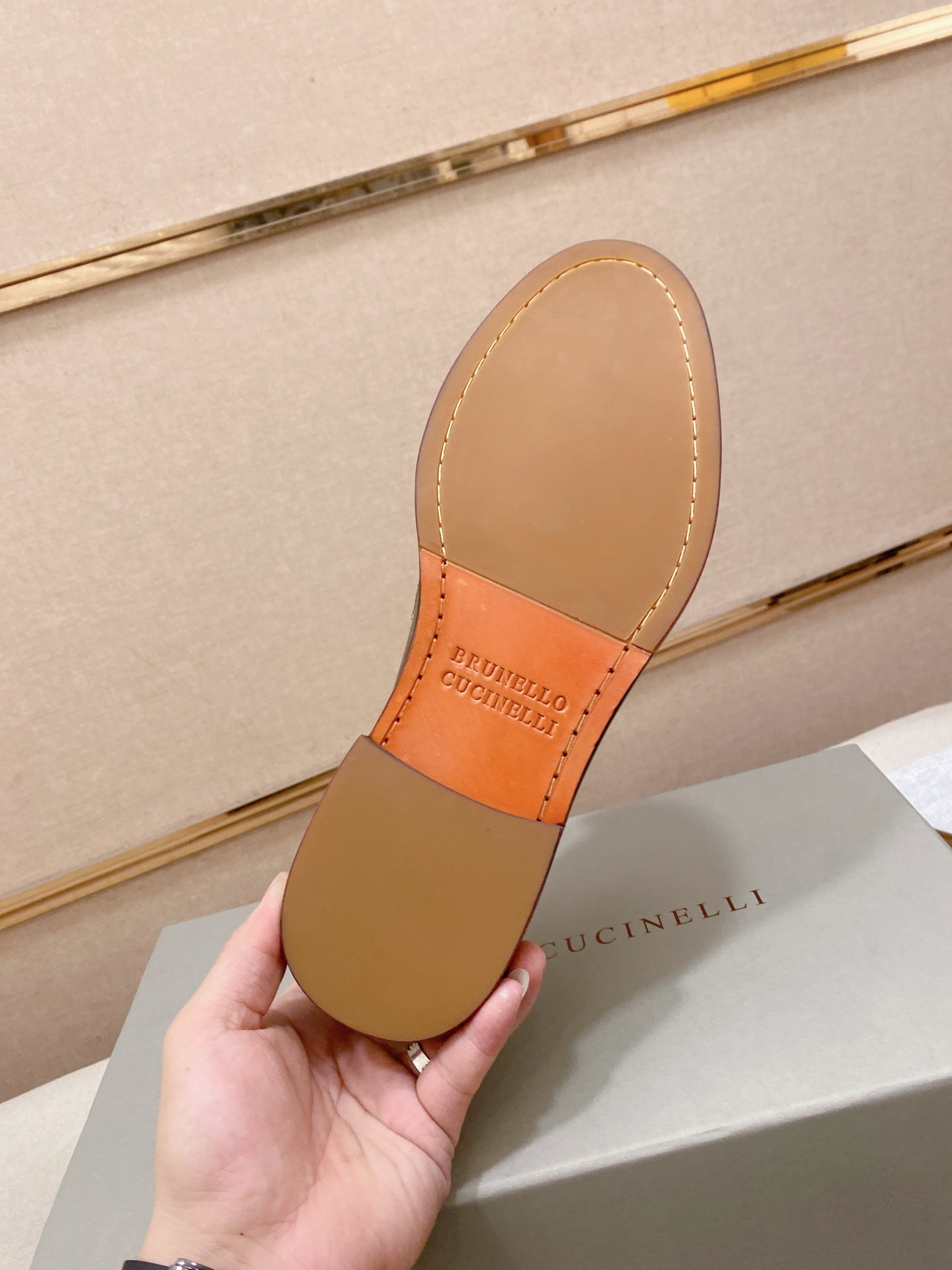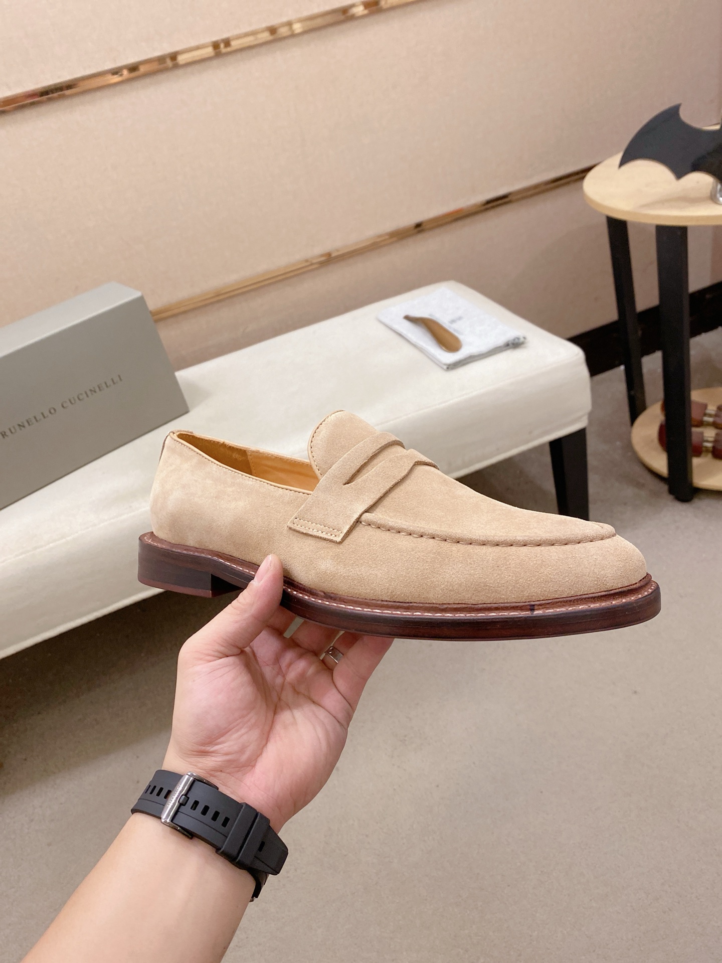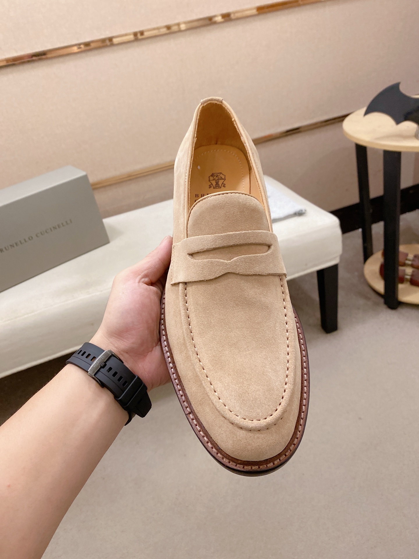 This shoes is AAAAA 1:1 quality (superb). Materials used are identical to the original ones. Brunello Cucinelli trademark marks are indistinguishable to the authentic. Photos take by actual shoes, what you receive will be 100% same with our photos.