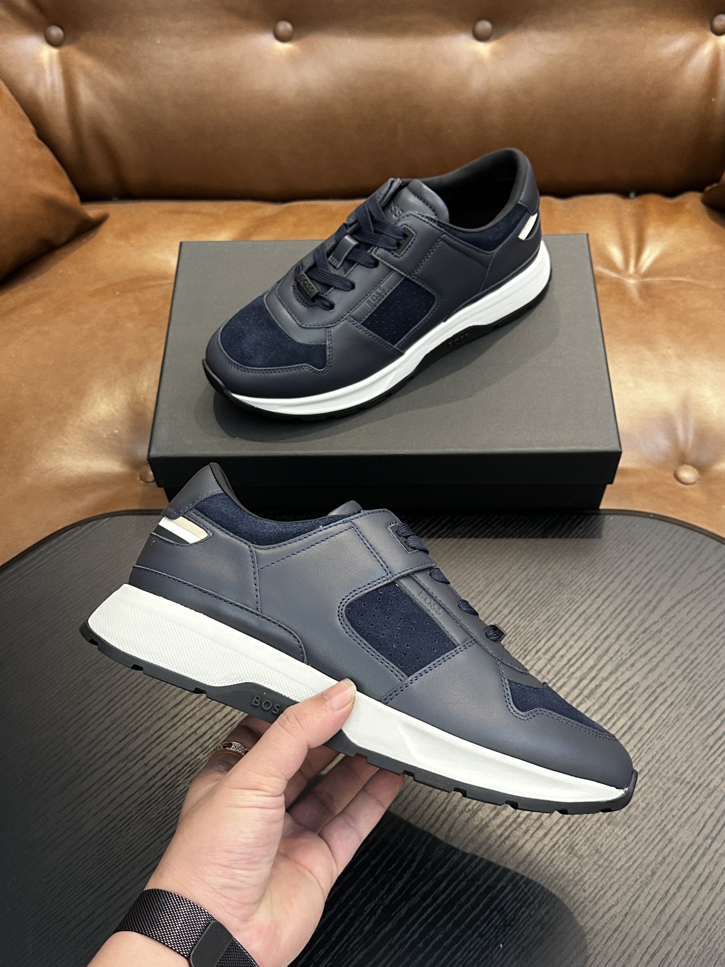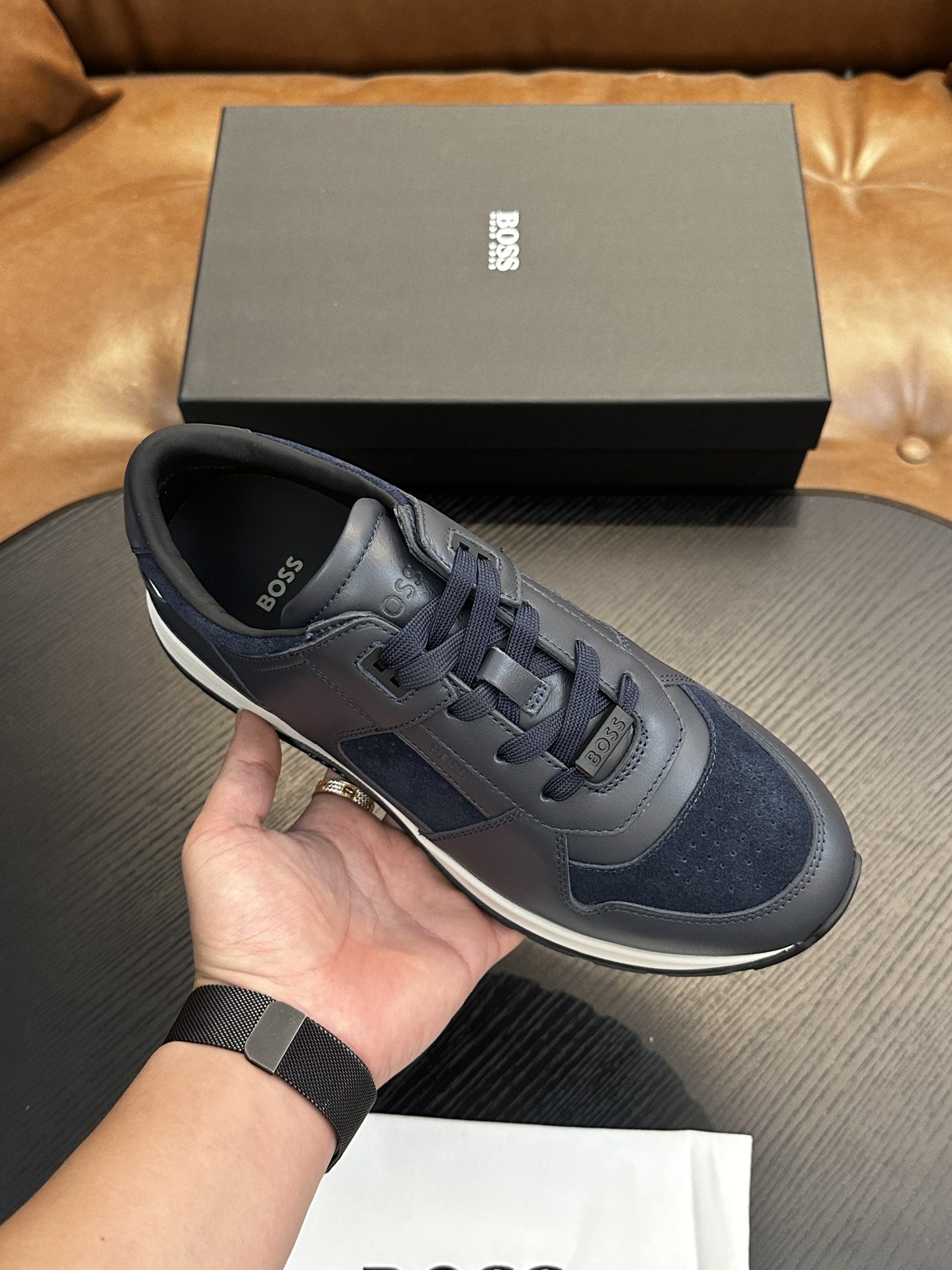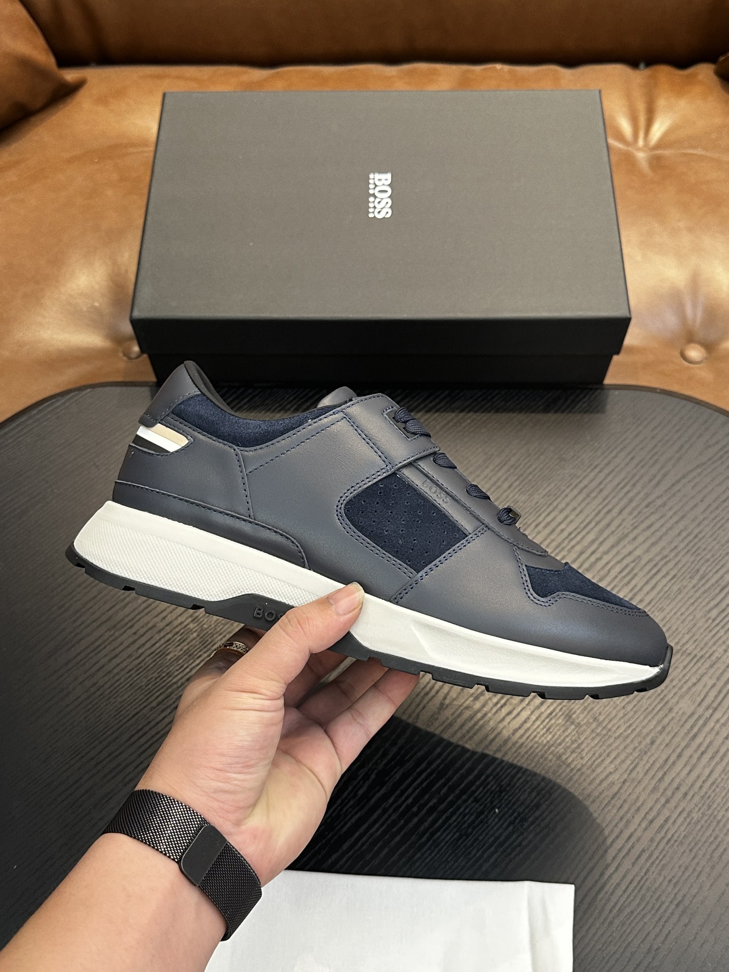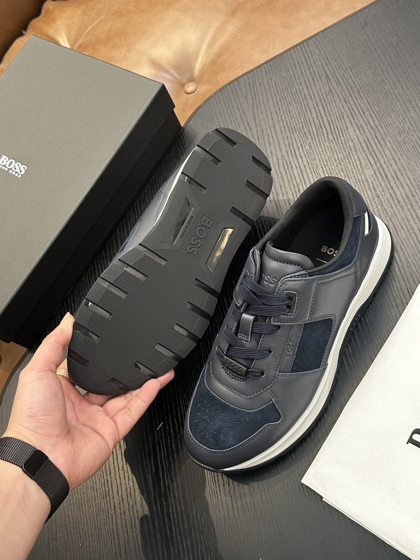 This shoes is AAAAA 1:1 quality (superb). Materials used are identical to the original ones. BOSS trademark marks are indistinguishable to the authentic. Photos take by actual shoes, what you receive will be 100% same with our photos.