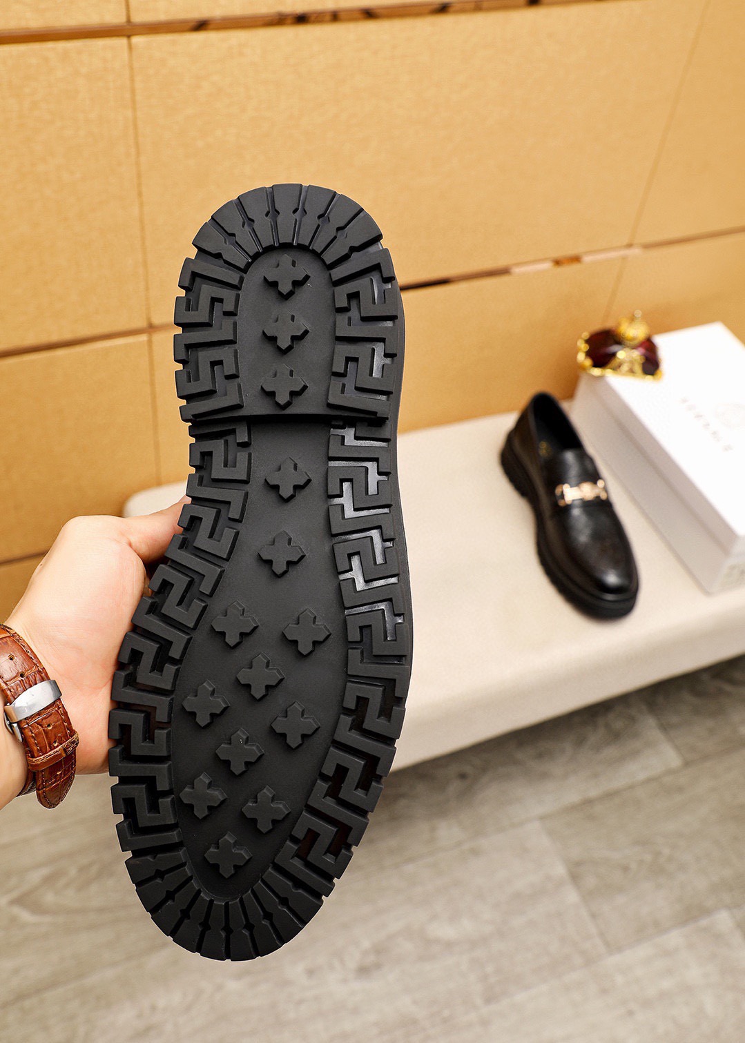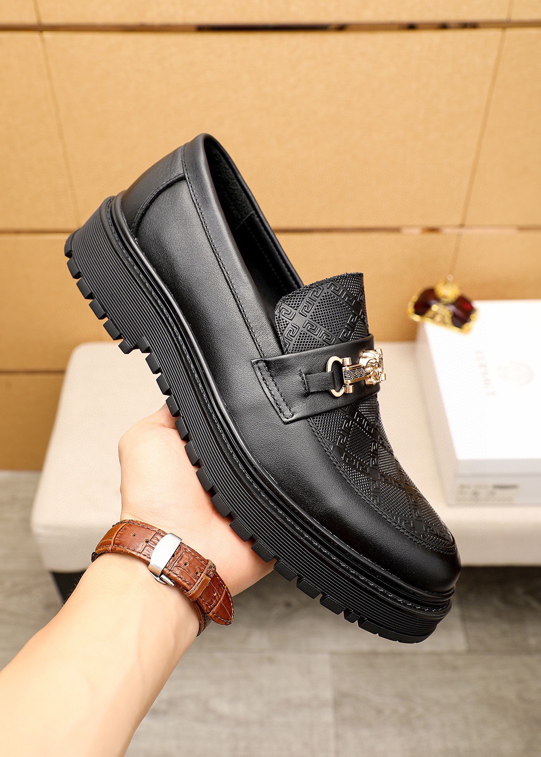 This shoes is AAAAA 1:1 quality (superb). Materials used are identical to the original ones. Versace trademark marks are indistinguishable to the authentic. Photos take by actual shoes, what you receive will be 100% same with our photos.